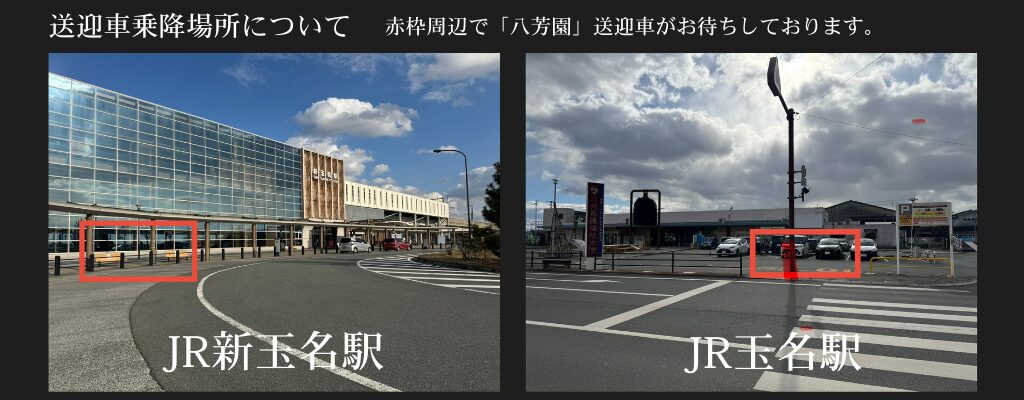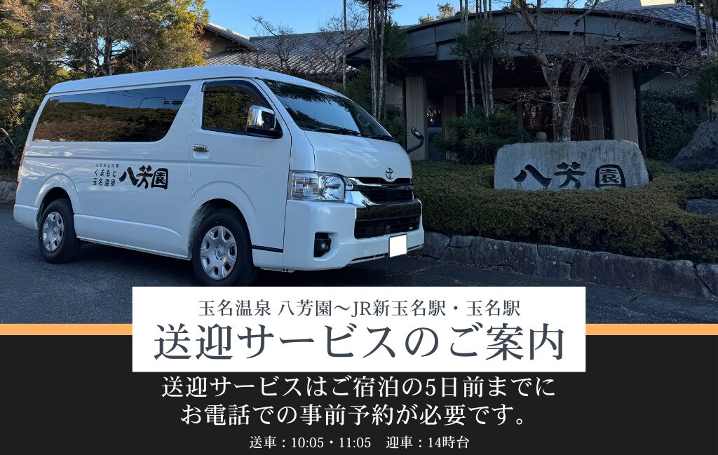 - お送り:(玉名温泉 八芳園 ⇒ JR新玉名駅(新幹線利用)・JR玉名駅) 10:05発 / 11:05発